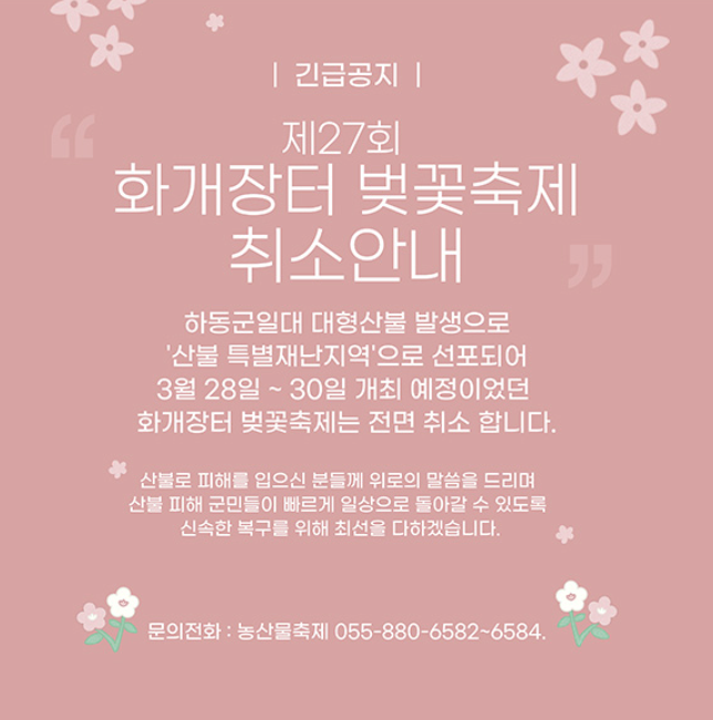- 하동군: 3월 28~30일 예정이던 ‘제27회 화개장터 벚꽃축제’ 전면 취소