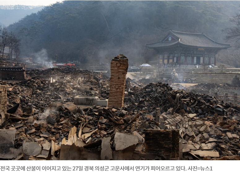 이번 산불로 인해 문화유산 피해도 심각한 수준입니다. 국가유산청에 따르면 국가지정 보물 2건, 천연기념물 3건, 명승 3건, 민속문화유산 3건 등 총 15건의 문화재가 훼손되었으며, 경북 의성의 천년 고찰 고운사도 불길을 피하지 못하고 소실되었습니다. 산불은 유네스코 세계문화유산인 안동 하회마을과 병산서원 인근까지 확산되면서 보존 문제에 대한 우려도 커지고 있습니다.