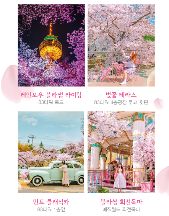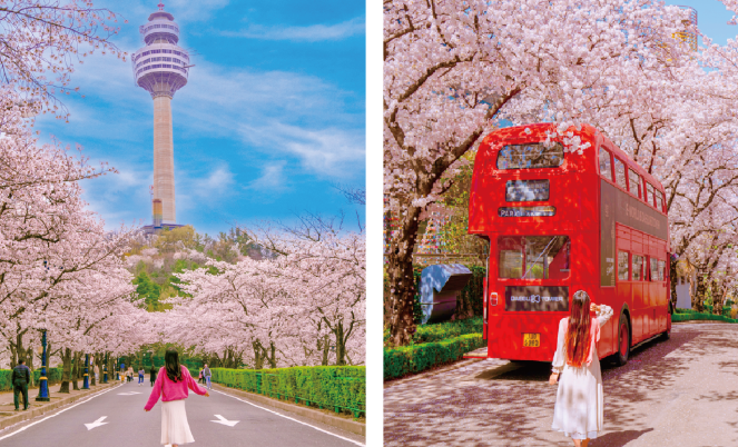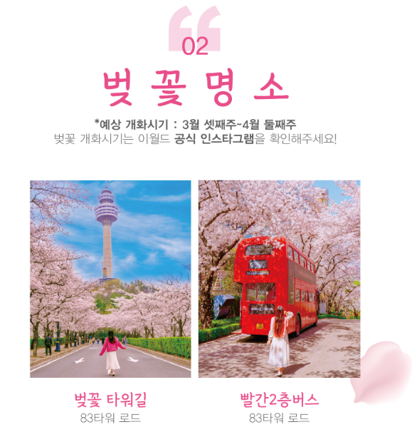 이월드의 벚꽃은 여의도보다 3배 많은 벚꽃나무로 이루어져 있어, 공원 전체가 벚꽃으로 물들어 봄의 정취를 만끽할 수 있습니다. 낮에는 핑크빛 벚꽃이 만개한 풍경을, 밤에는 라이팅 쇼와 함께 화려하게 빛나는 벚꽃의 색다른 모습을 즐길 수 있습니다. 특히, 회전목마와 빨간 2층 버스 등 다양한 벚꽃 포토존과 전망대에서 바라보는 벚꽃 스카이뷰는 이월드만의 특별한 경험을 제공합니다.
