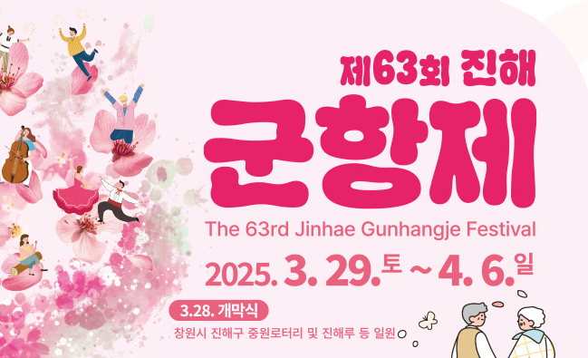 2025년 제63회 진해 군항제는 3월 28일(금)부터 4월 6일(일)까지 총 10일간 개최될 예정입니다. 축제 기간 동안 진해구 일대는 36만 그루의 왕벚나무가 만개하여 장관을 이룹니다. 특히, 여좌천, 진해루, 장복산공원 등 주요 벚꽃 명소에서는 꽃비가 흩날리는 봄의 향연을 만끽할 수 있습니다.