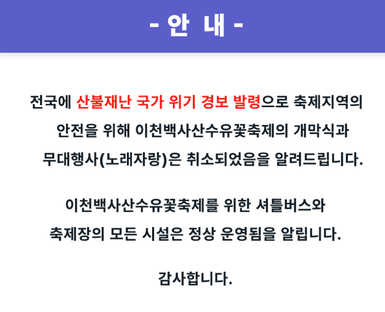 특징: 산불 국가재난 심각 단계 격상에 따라 연기 결정. 추후 일정은 산불 상황 안정화 후 확정 예정.